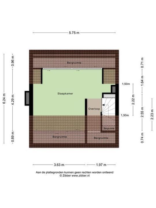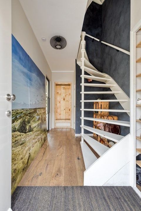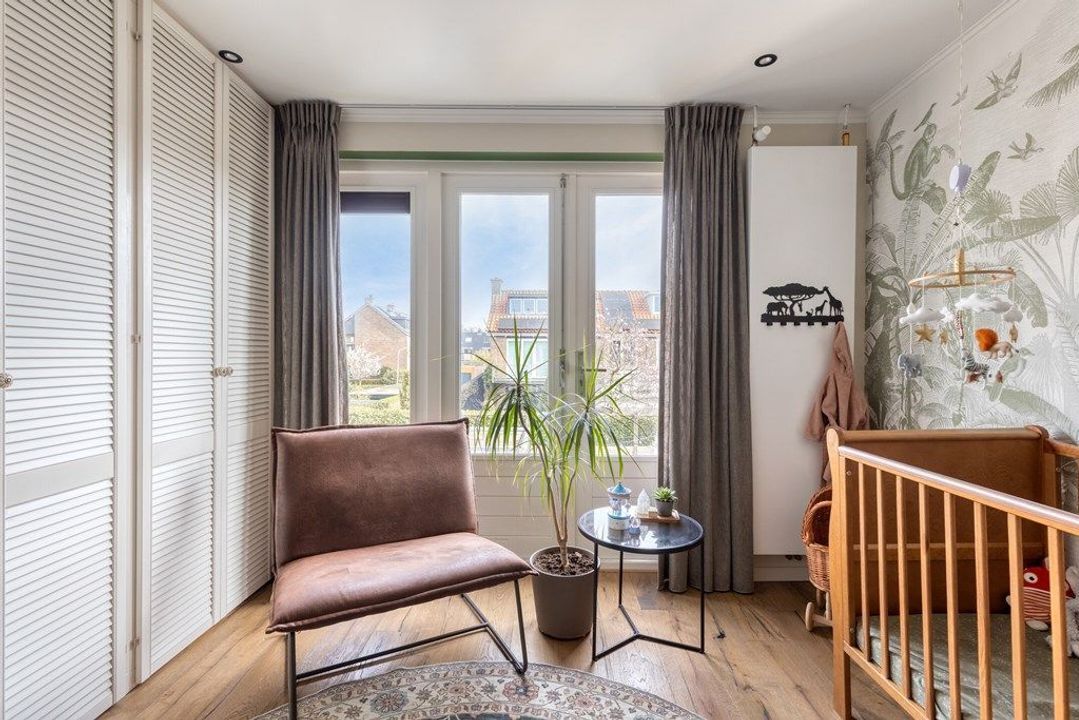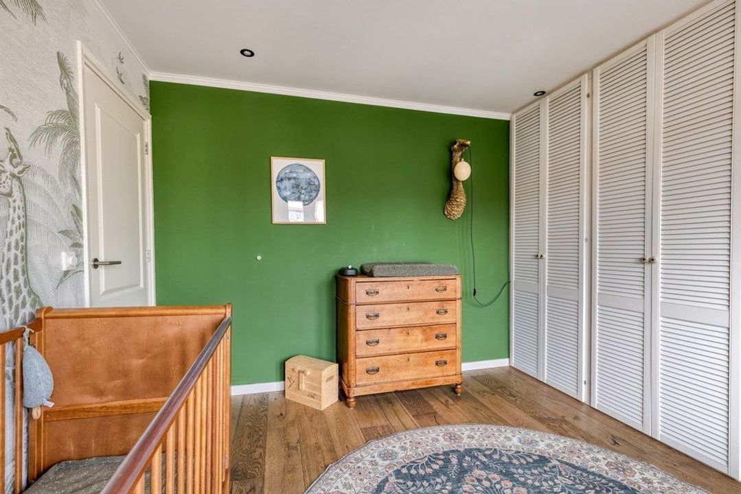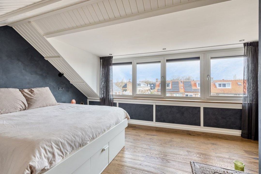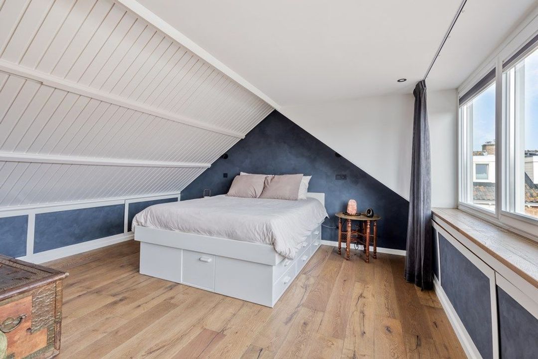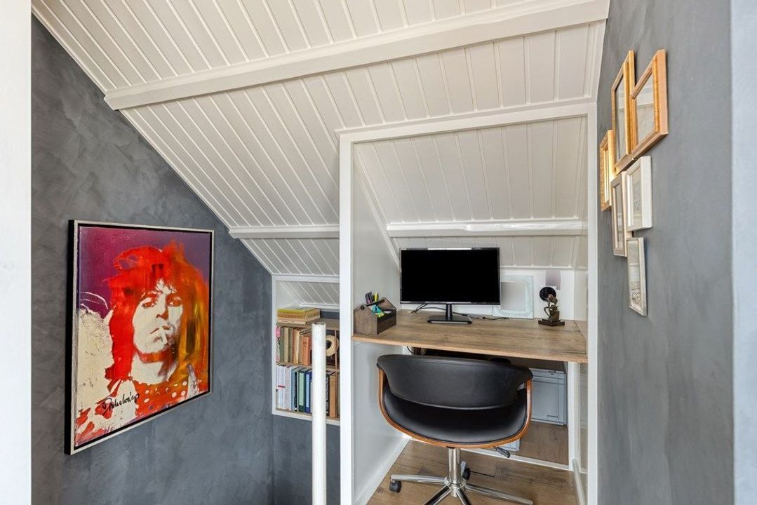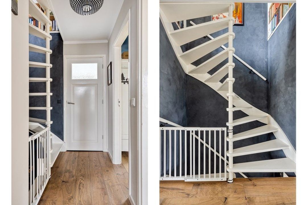 Trap naar de zolder verdieping, hier is een ruime ouderslaapkamer, met werkplekje en opbergruimte onder het schuine dak. Op het dak zijn zonnepanelen aangebracht.