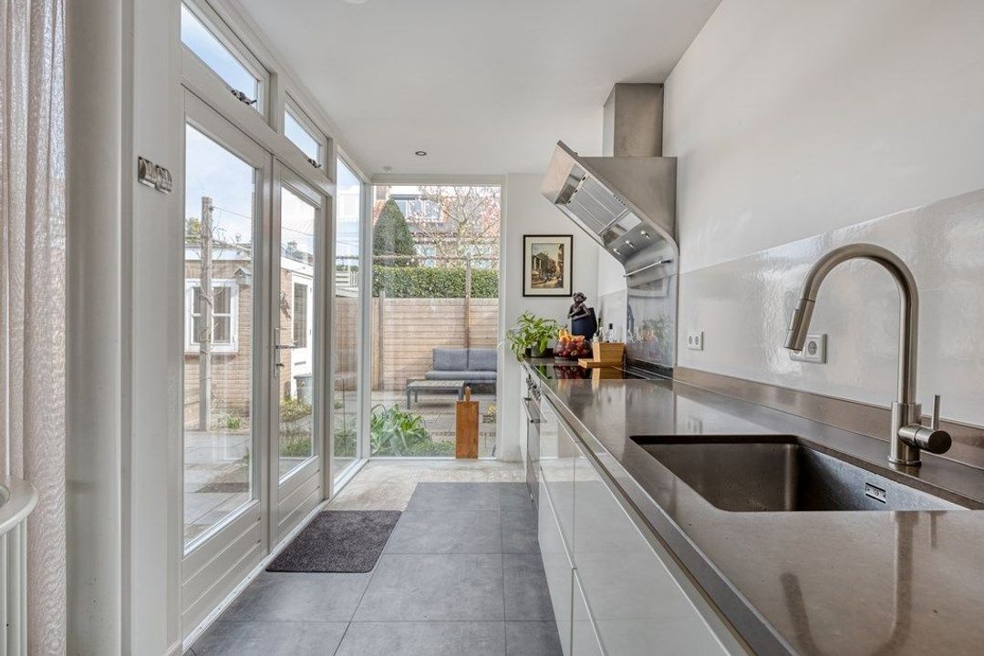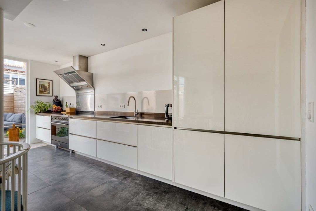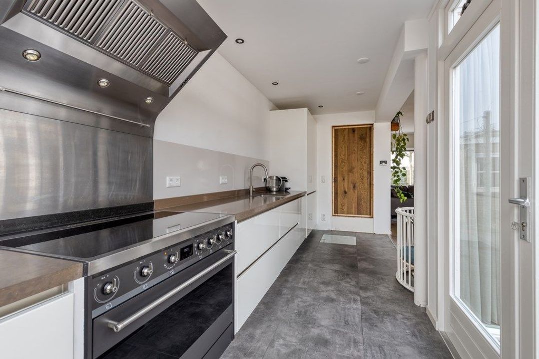 Voortuin, entree van de woning, gang met toilet, deur naar de lichte woonkamer met open keuken. De woonkamer is uitgerust met een houtkachel voor een fijne sfeer in de wintermaanden, heeft openslaande deuren naar de tuin en staat in open verbinding met de keuken. De keuken is recent geplaatst, erg licht door de enorme raampartij en uitgerust met koelkast, vriezer, vaatwasser, riant fornuis met kookplaat en gootsteen.
