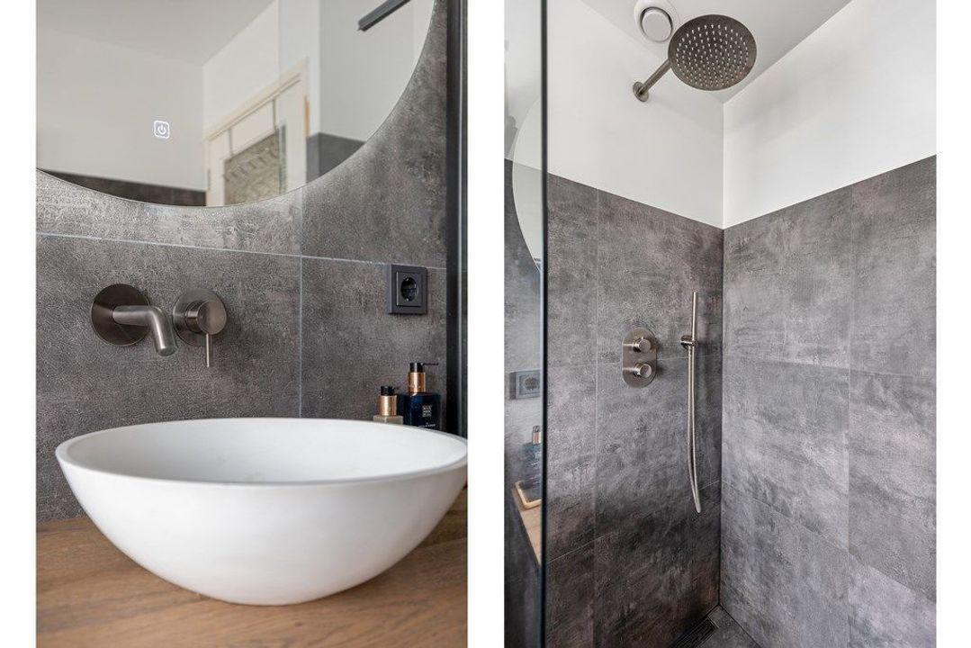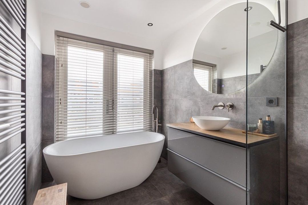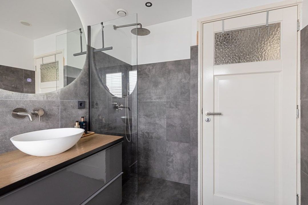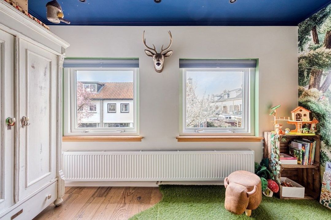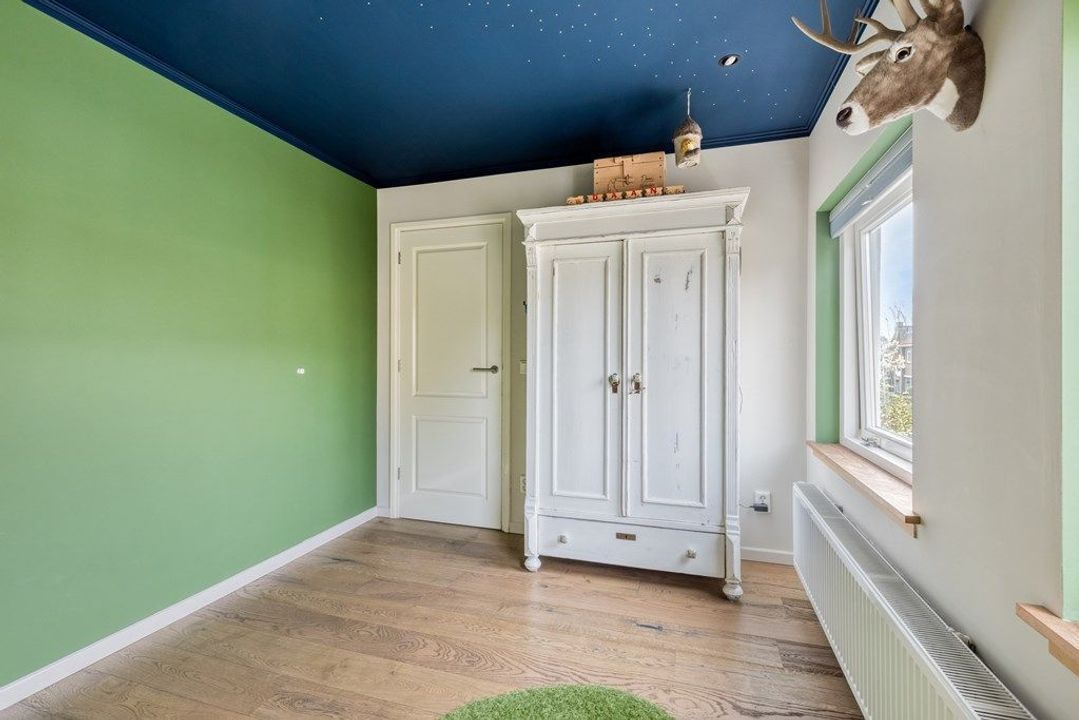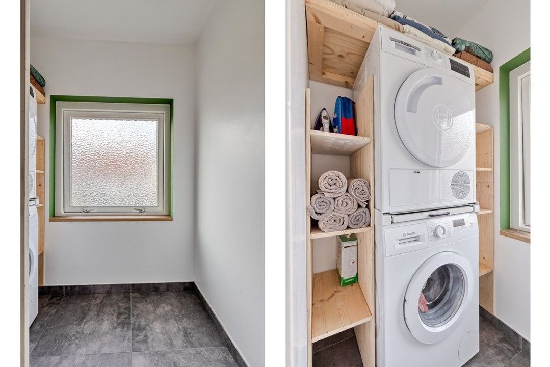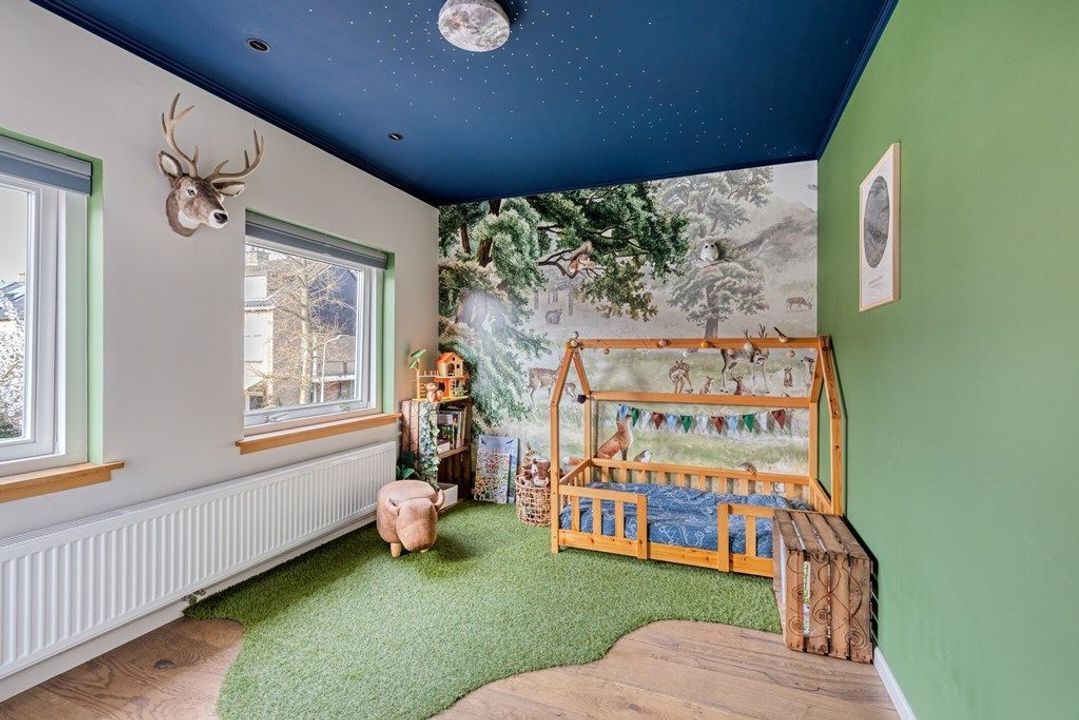 Trap naar de eerste verdieping, de gang biedt toegang tot alle vertrekken, twee slaapkamers, de badkamer en de wasruimte. De styling van de kinderslaapkamers is erg leuk gedaan en zijn net als de rest keurig afgewerkt. De badkamer is uitgerust met ligbad, inloop regendouche en wastafel. In een aparte ruimte staan de wasmachine en droger.