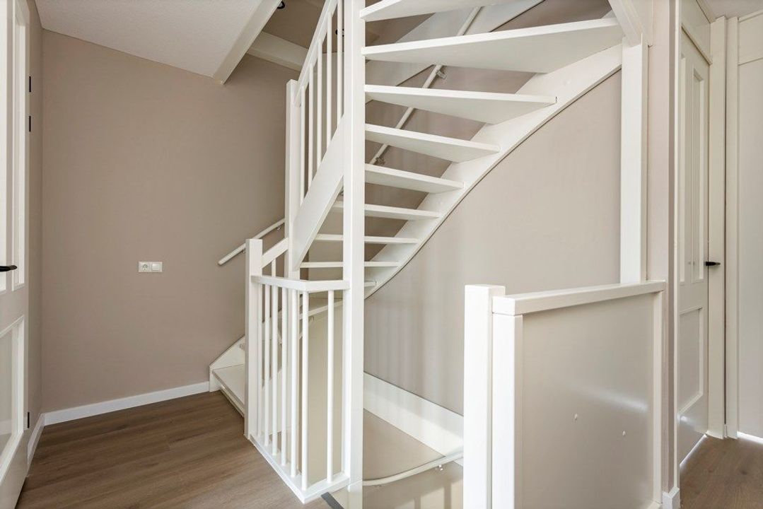 Trap naar de 1ste etage, de gang geeft toegang tot alle vertrekken, 3 slaapkamer, de 1ste badkamer, toilet en trap naar de 2e verdieping.