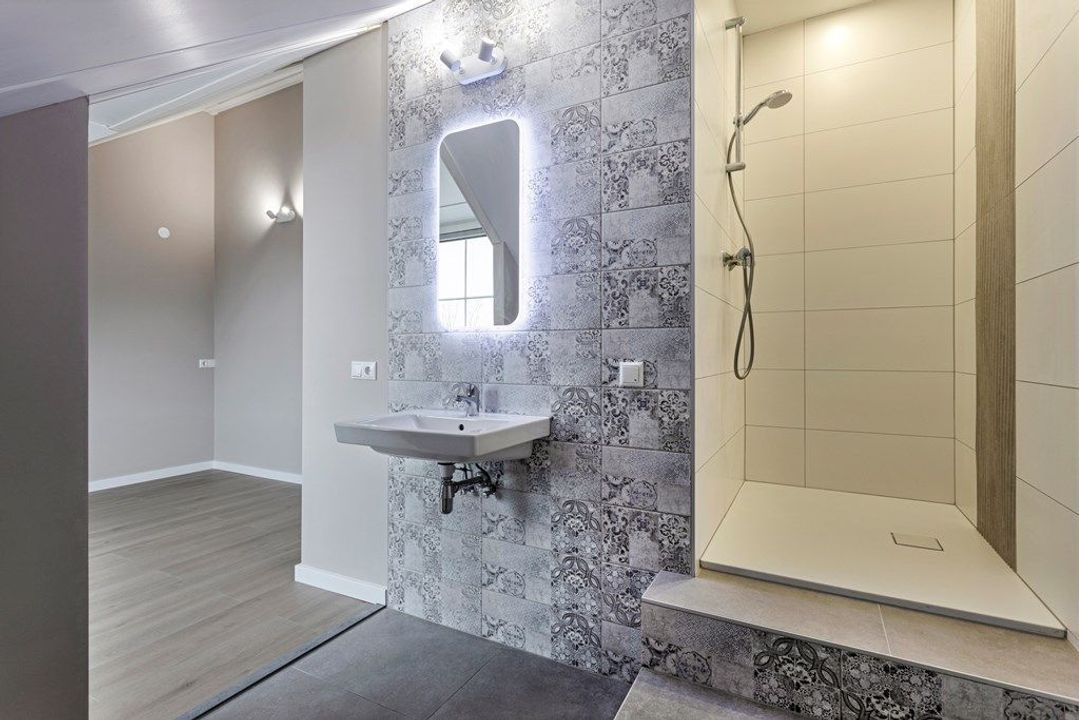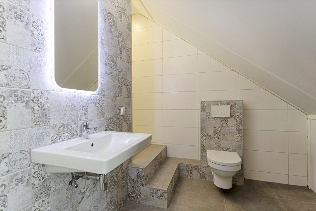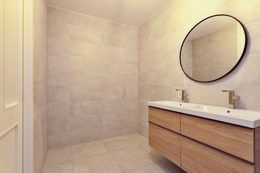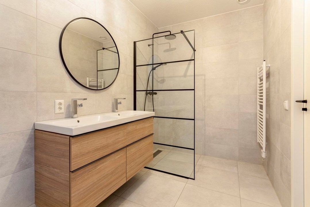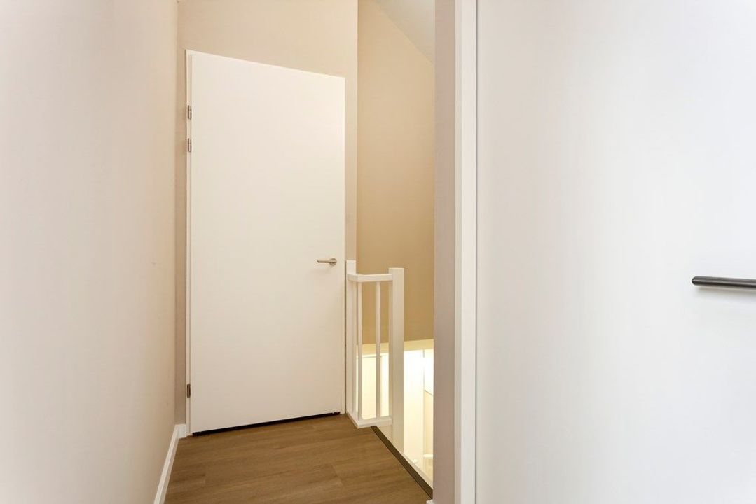 Trap naar de 2e etage, de gang geeft toegang tot beide slaapkamers. Riante lichte slaapkamer met de 2e badkamer en suite. Sfeervol afgewerkte en voorzien van regendouche, wastafelmeubel en toilet. Ideaal voor gasten, au pair of inwonende ouders.