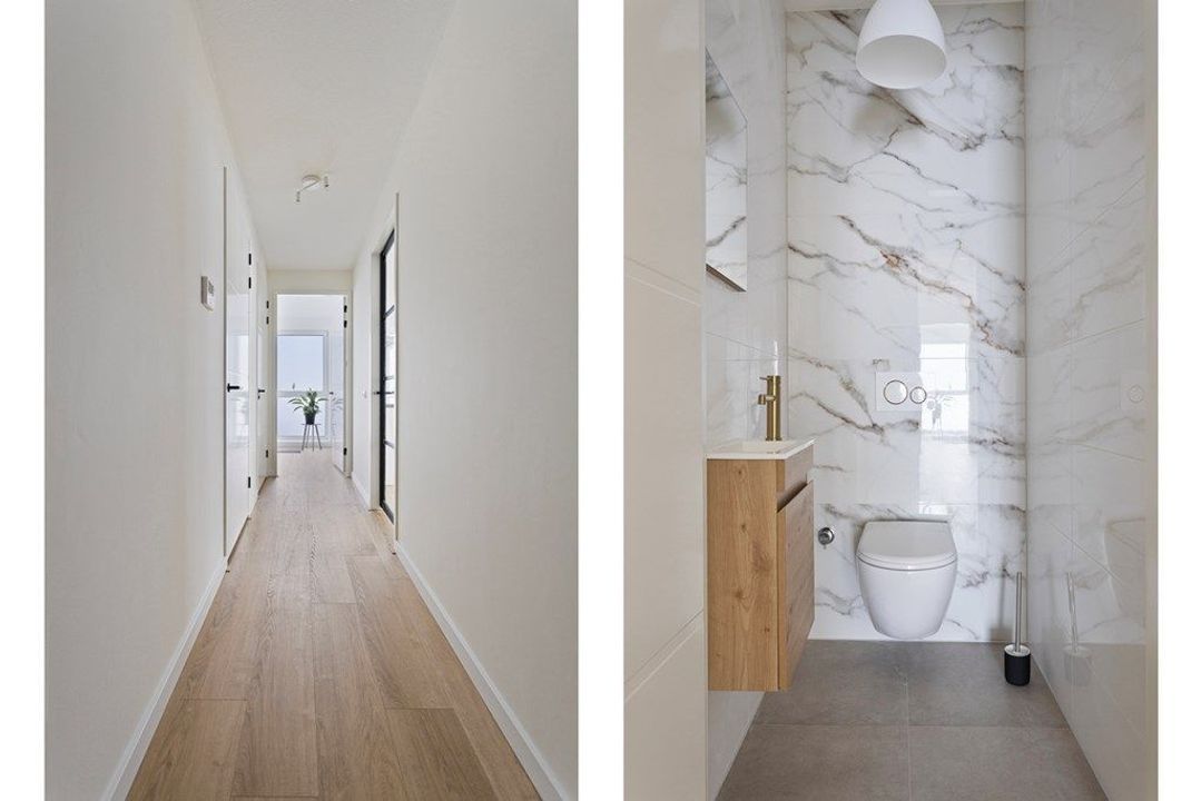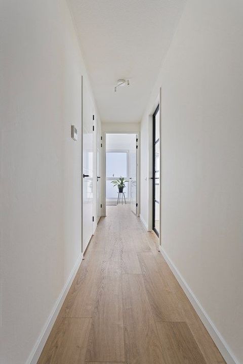 Gezamenlijke entree op straatniveau, met de lift naar de etage, ongekend hoog, entree van de woning. De gang geeft toegang tot alle vertrekken, de woonkamer met open keuken, de slaapkamers, de moderne badkamer, de berging en het toilet.