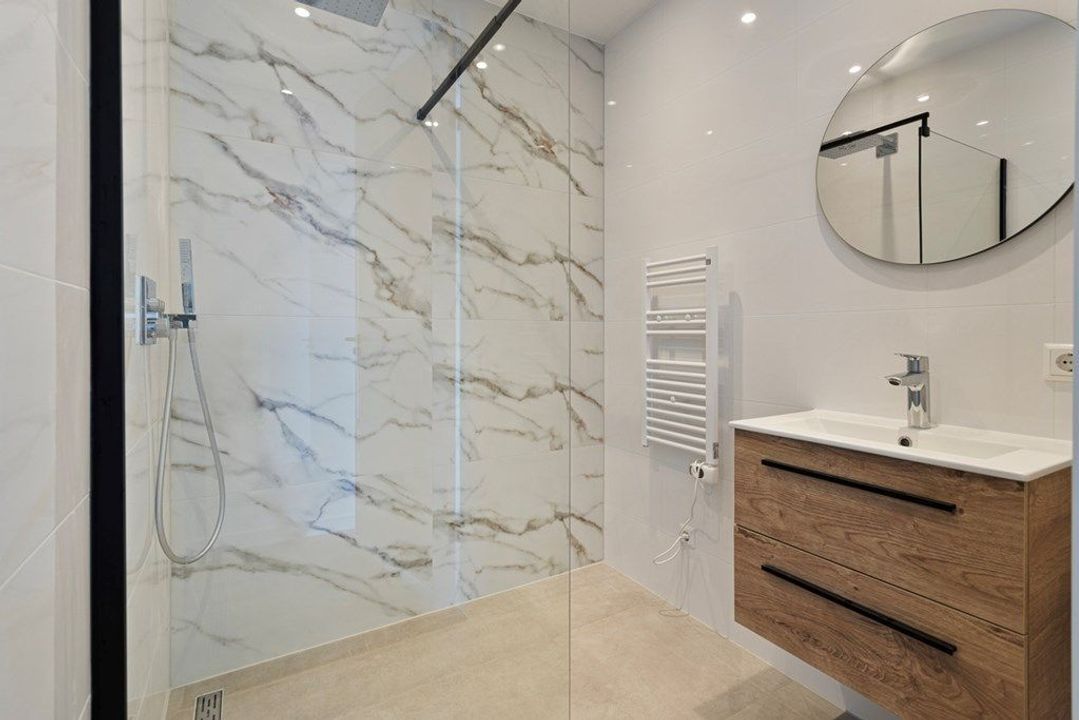 Luxe badkamer met ruime inloopregendouche en wastafel met wastafelmeubel. Tot in de puntjes verzorgd en afgewerkt. Separaat toilet in dezelfde stijl.