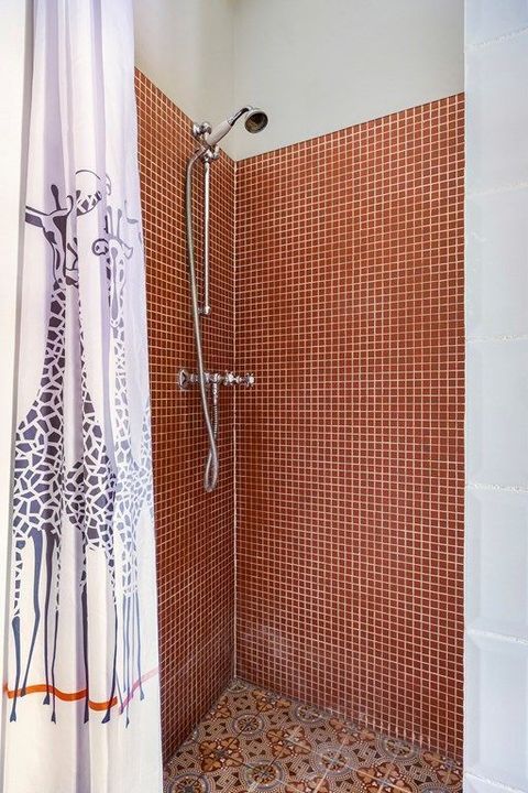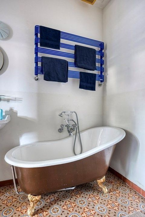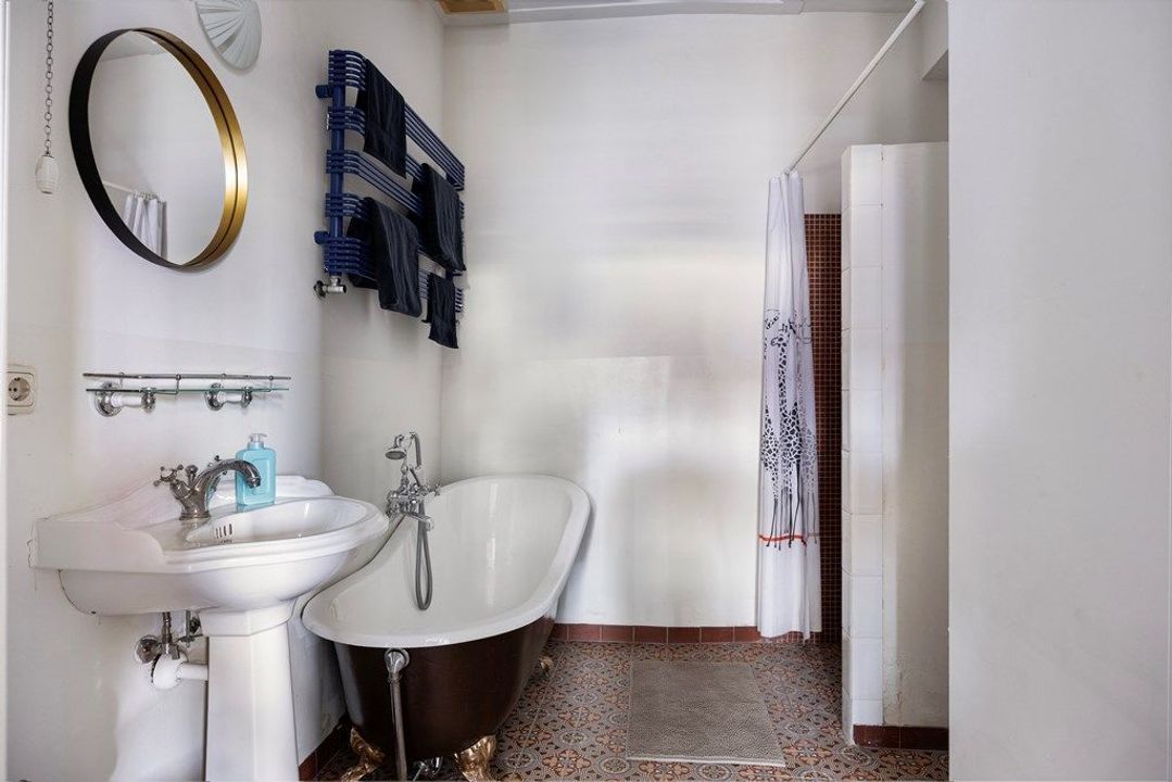 De badkamer is uitgerust met douche, ligbad, wastafel, toilet en wasmachine. De gemakken van de moderne tijd, in een stijl die harmonieus samen gaat met het karakter van het pand.